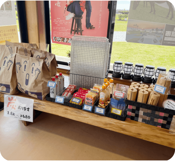 管理棟ではキャンプでよく使う消耗品などを販売しています。(13:00〜17:00)